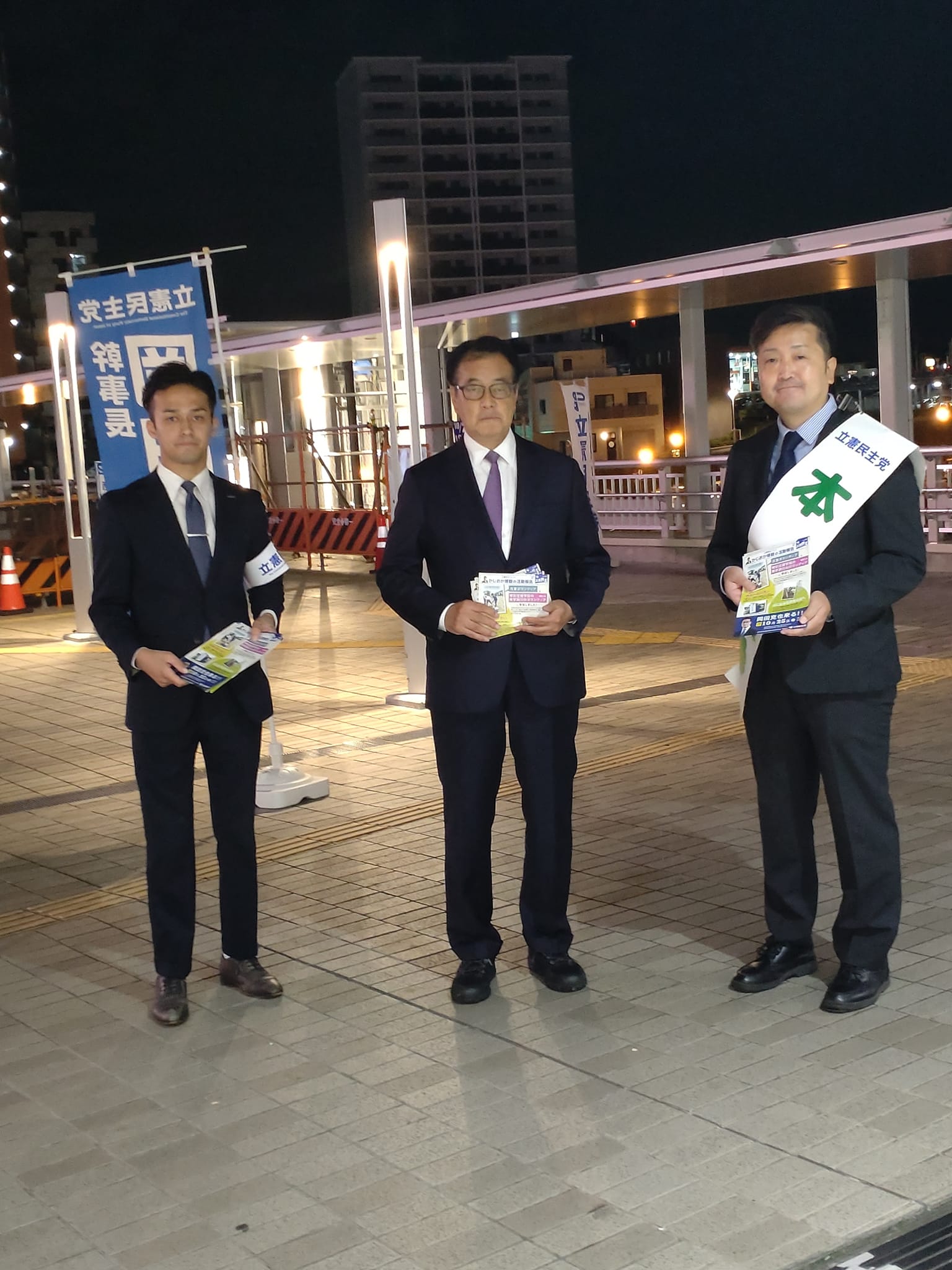 演説会終了後、岡田幹事長は20時まで梶岡博樹のチラシ配りを手伝ってくださり、